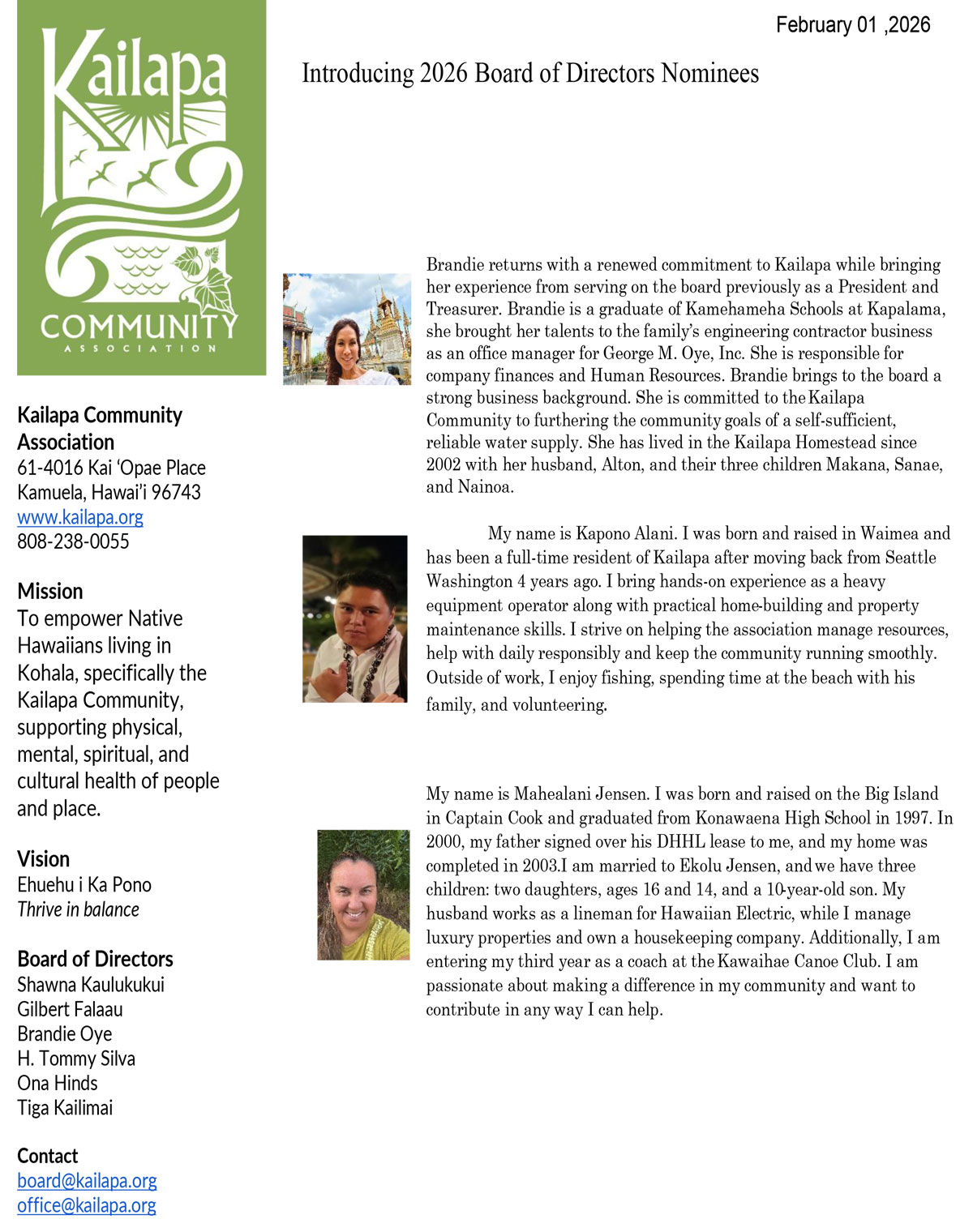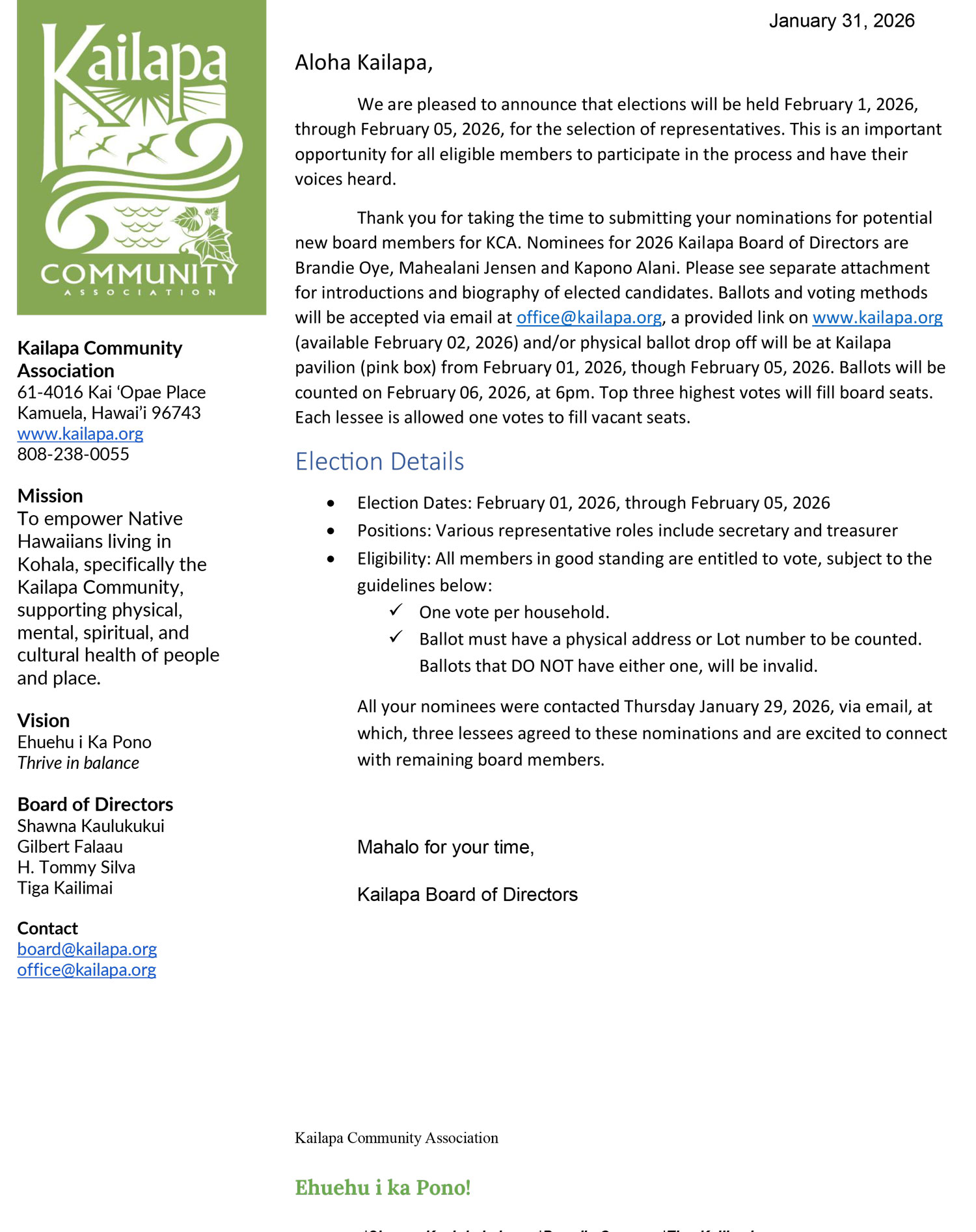 Nominees for 2026 Kailapa Board of Directors are Brandie Oye, Mahealani Jensen and Kapono Alani. Please select your vote below. Ballots will be accepted via email at office@kailapa.org, provided link on Kailapa.org and/or physical ballot drop off will be at Kailapa pavilion (pink box) from February 01, 2026, though February 05, 2026. Ballots will be counted on February 06, 2026, at 6pm. Valid ballots require a physical address or Lot number. Ballots that do not have either physical address or Lot number will be disqualified and not counted. Top three highest votes will fill board seats. Each lessee is allowed 1 votes to fill vacant seats. Mahalo for your time and participation.