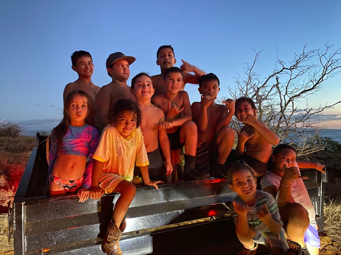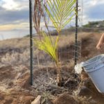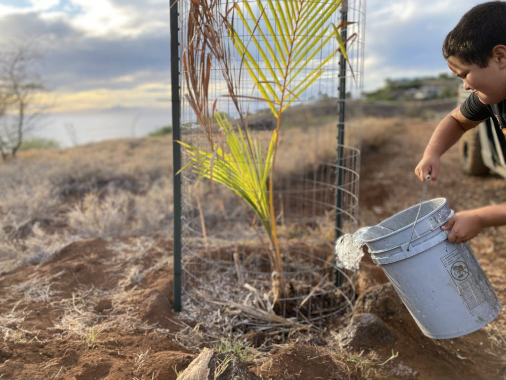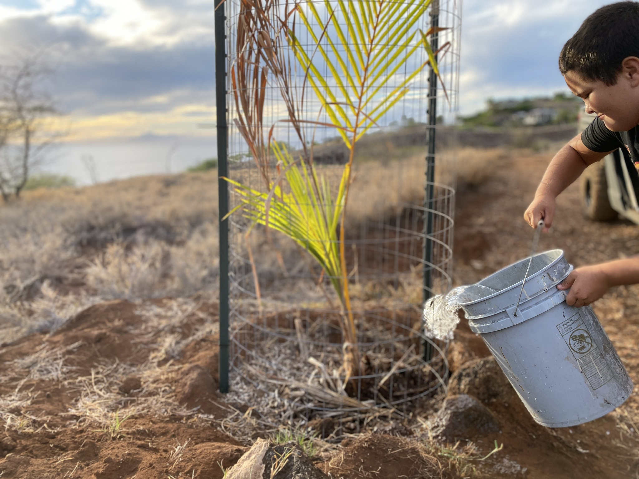 Eight full moons ago our community and ʻohana ranging from keiki to kūpuna gathered together to plant 24 niu to physically represent our presence and commitment to our shoreline and ensure that this sacred suspended water will be present for the many generations to come, in that they will always have wai or wai niu when accessing ma kai in the future. With the planting of our Niuola came the kuleana of caring for it. With no established water system ma kai our families have committed to watering these niu by hand. For the first several weeks we were watering every three days, from then it has tapered down to once a week. Our niu are growing strong and resilient as we are along with them, and our keiki have fully stepped into this kuleana running the water tank and 5 gallon buckets themselves to each niu. The joy that our keiki express when working together amongst family, neighbors, and dedicated community members is immeasurable and by far epitomizes Aloha ʻĀina.